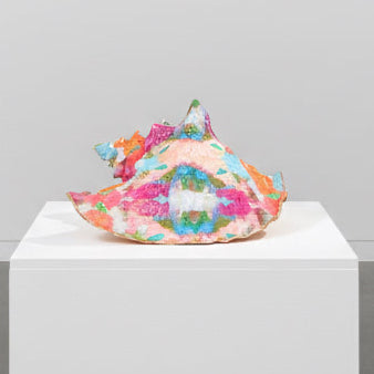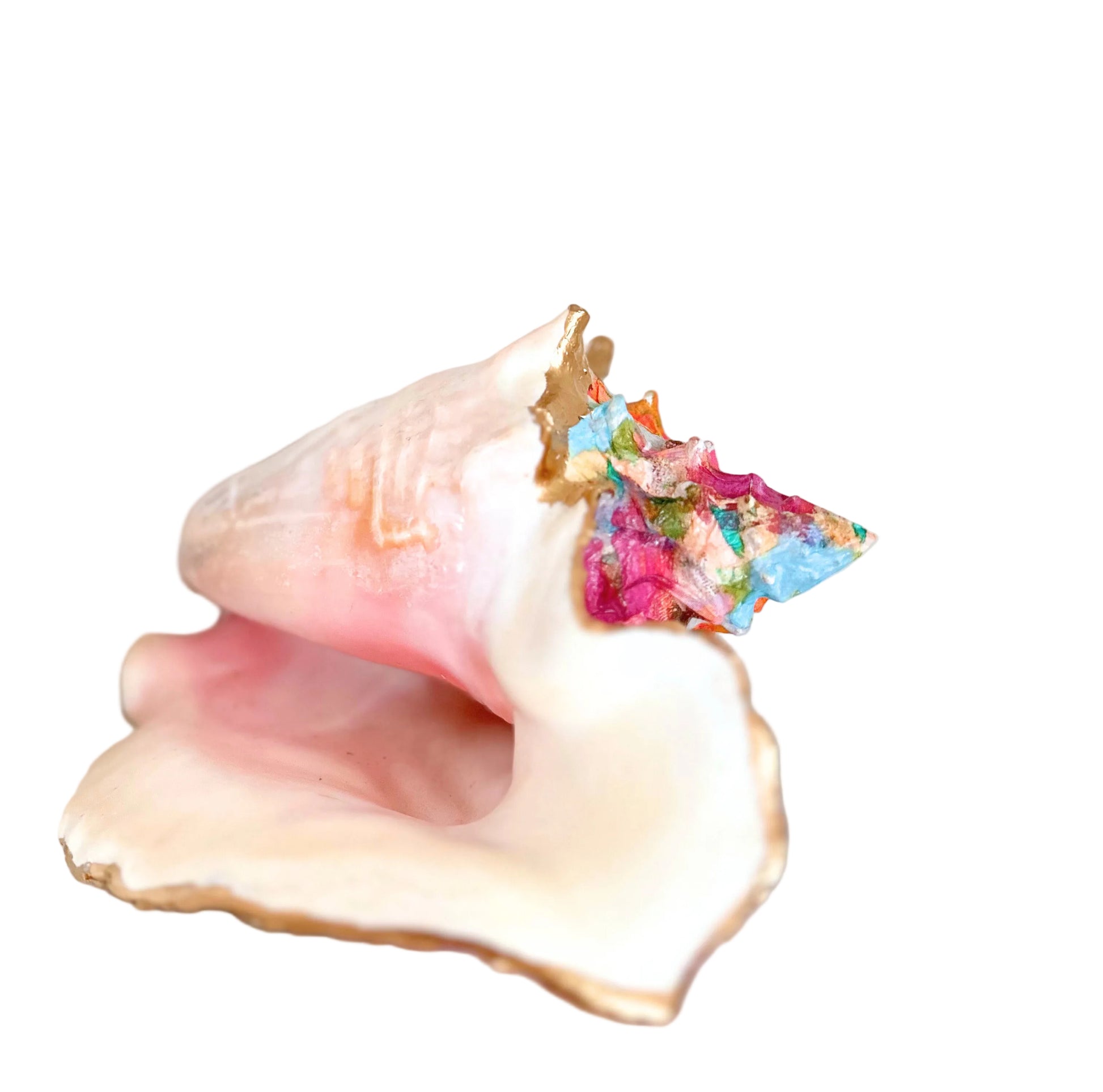 Inspired by turquoise water and cotton-candy skies, this queen conch shell is treated as a canvas on one side, wrapped in designer Laura Parks Begonia pattern, and left completely natural on the other. Then delicately trimmed in gold.