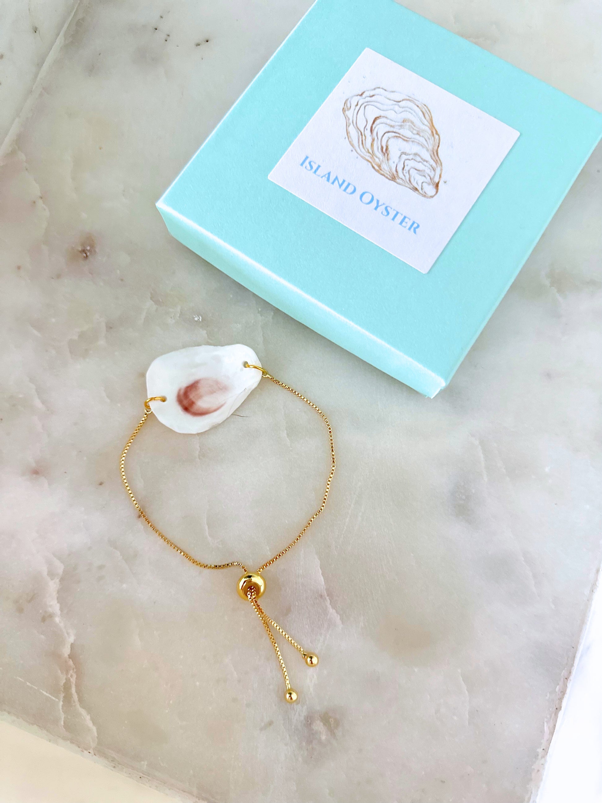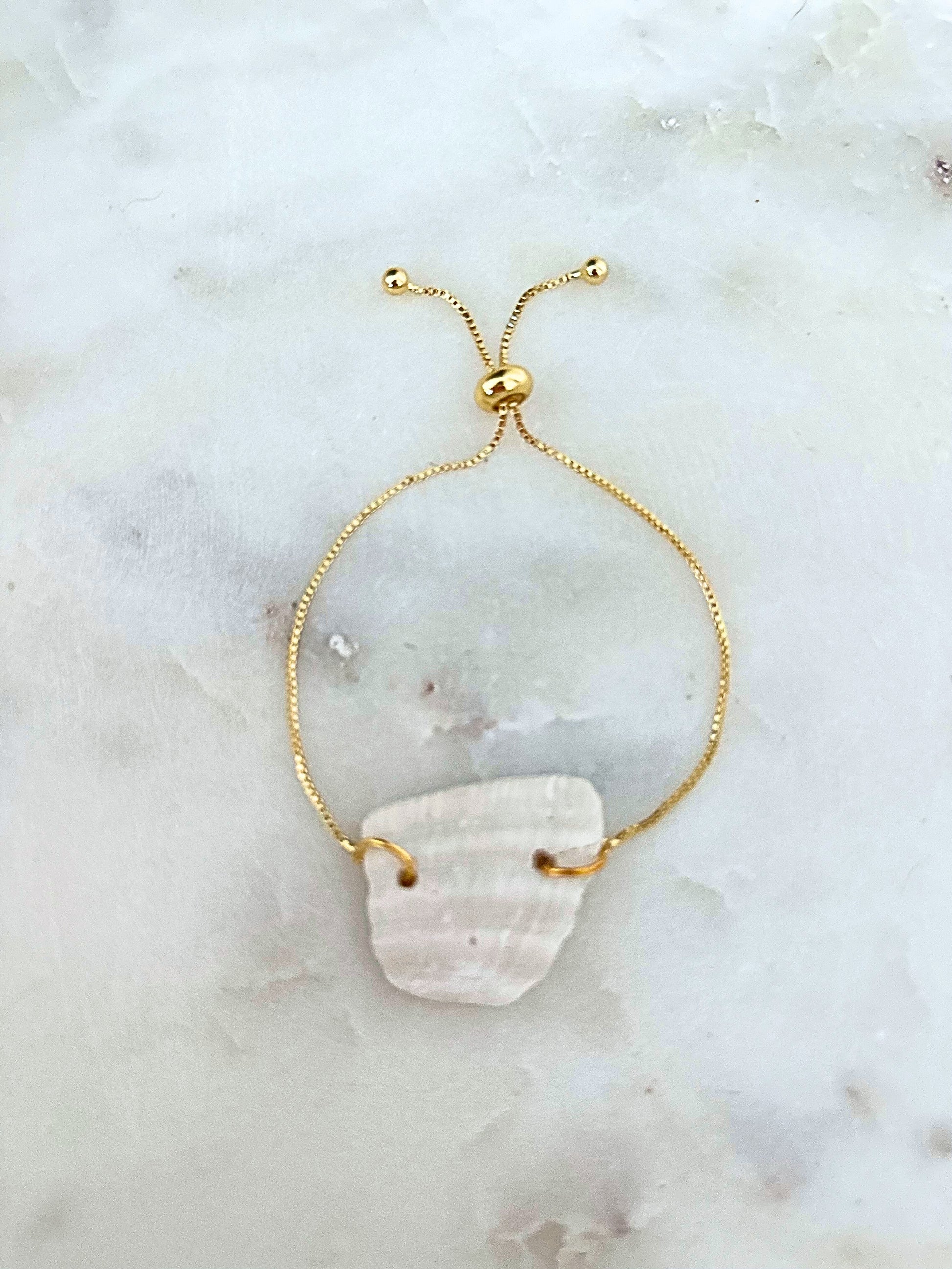 Embrace coastal elegance with our dainty gold shell bracelet. Crafted with sustainably sourced oyster shells, scallop shells, and ribbed shells, each piece captures the essence and charm of the Carolina coast.