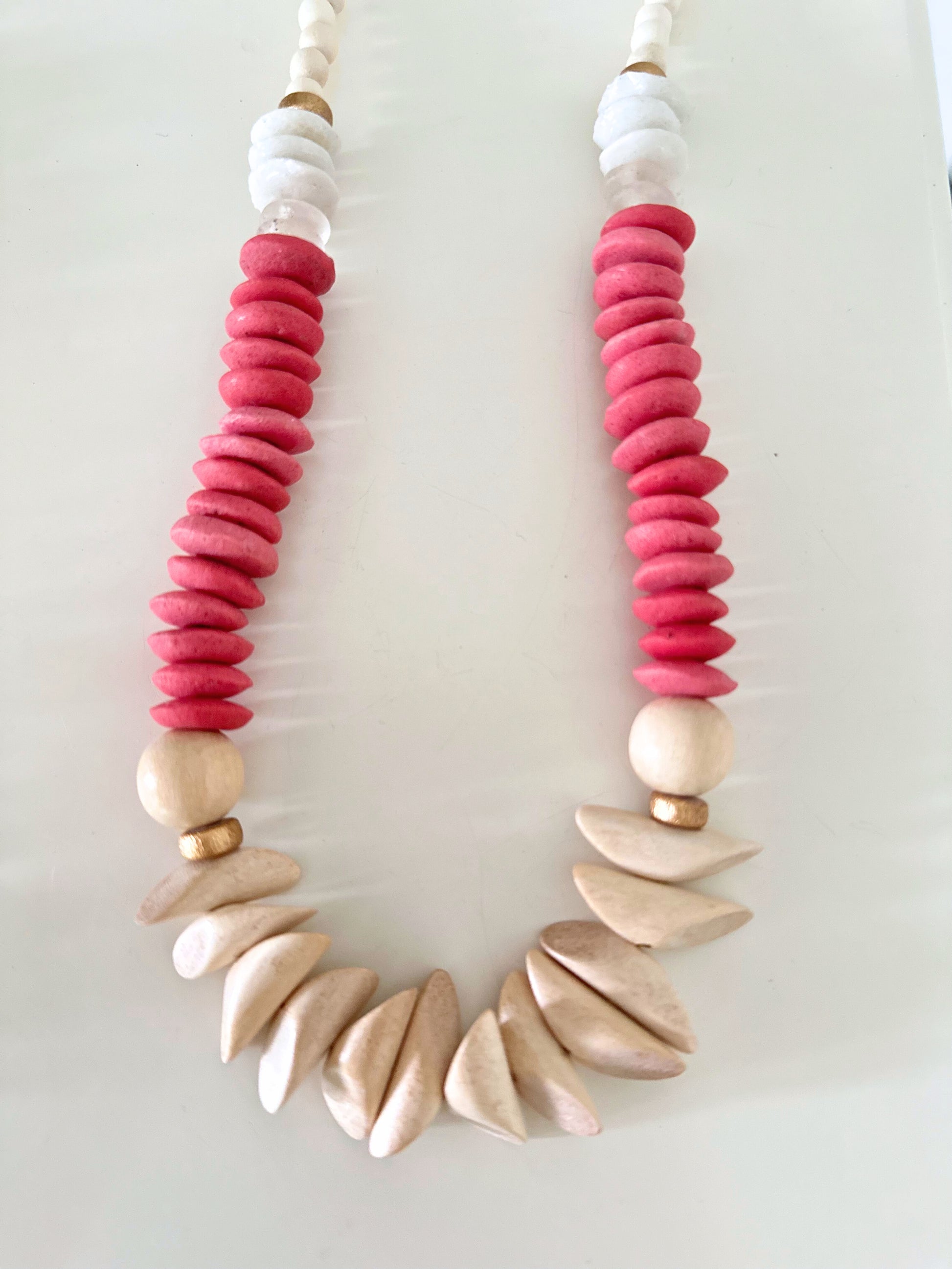 Smooth, organic wood pieces anchor the base with natural movement and earthy charm, contrasted by soft Carolina blue glass Ashanti beads, or white, or deep coral that evoke the calm of low tide.