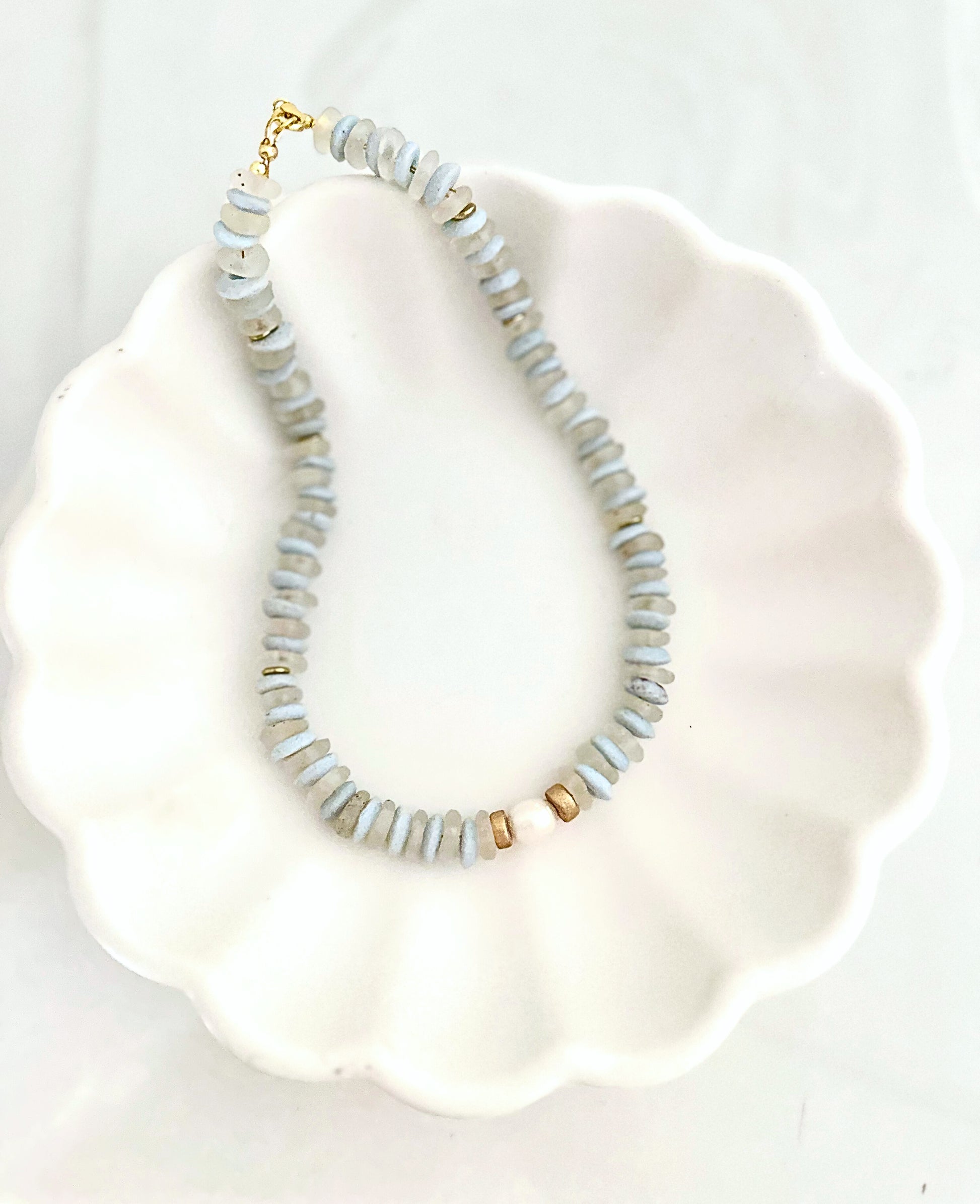 Inspired by the rhythm of the tides, the Tidal Strand Necklace brings a touch of coastal energy to your everyday style. Fresh water Pearl and gold accents pair beautifully on this piece with 100% artisan glass beads from Ghana. All Fair Trade and uniquely irregular due to the handcrafted nature.